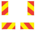 15. Ilgesnės kaip 12 m transporto priemonės be priekabos (išskyrus autobusus ir troleibusus) gale turi būti įrengti simetriškai transporto priemonės ašiai išdėstyti stačiakampio formos nuo 130 mm iki 150 mm pločio skiriamieji ženklai su įstrižomis (45° kampu) raudonomis fluorescencinėmis ir geltonomis šviesą atspindinčiomis juostomis ir tvirtinami taip, kad žemyn einančios įstrižos juostos būtų nukreiptos transporto priemonės krašto link. Ir raudonų, ir geltonų juostų plotis – 100 mm. Šių skiriamųjų ženklų skaičius, išsidėstymas ir bendras ilgis turi atitikti 14 punkte numatytus reikalavimus.